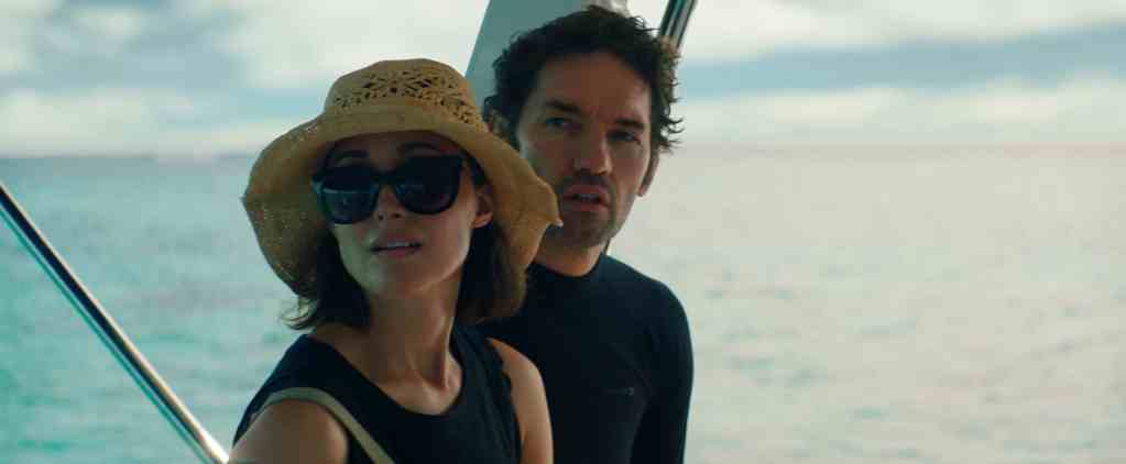 In dark comedy Shark (Australia, 2021), Jack (director Nash Edgerton) and Sofie (Rose Byrne) are a match made for each other — it’s doubtful that anyone else might be able to put up with their love of trying to one-up each other on pranks, some of which depend on trying to frighten the other person. On a snorkeling excursion as part of their tropical honeymoon, Jack finds a fake shark fin on board, and Sofie advises him not to do what he is considering. Suffice it to say that he should have listened to his new bride. Edgerton and Byrne have terrific chemistry as the caper-loving couple, and the former, who cowrote the screenplay with David Michȏd, keeps the proceedings running at a fast clip, balancing the humor and suspense winningly.