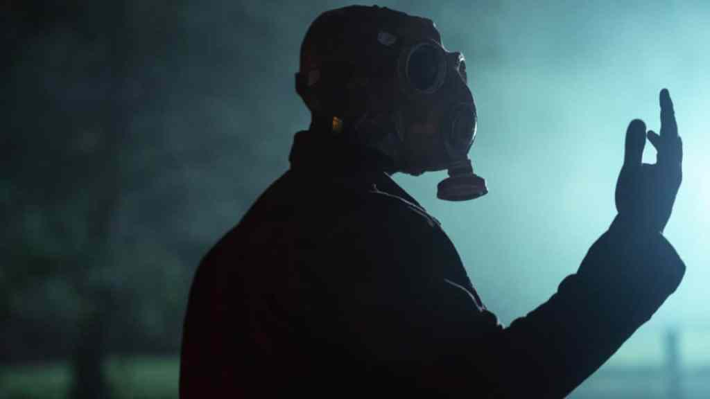 With farm animals and pets in the area acting strangely recently including inflicting self harm, the family and their neighbors are puzzled by a series of weird events. Not the least of these is a masked stranger (Rob Morgan) painting a line which he warns the locals not to cross — viewers get to see the gruesome results of doing so in chilling, escalating effects — and, by writing on a board, tells them to trust no one.